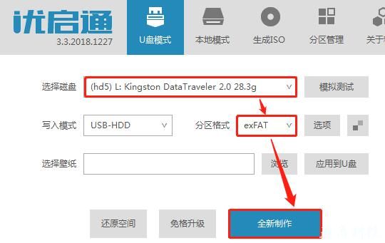 1.首先下載優(yōu)啟通制作工具,然后制作U盤啟動盤,完成后將U盤插在電腦上。注:如果U盤所需存儲的系統(tǒng)鏡像文件大于4GB,那么在制作U盤時推薦選擇exFAT或NTFS格式。