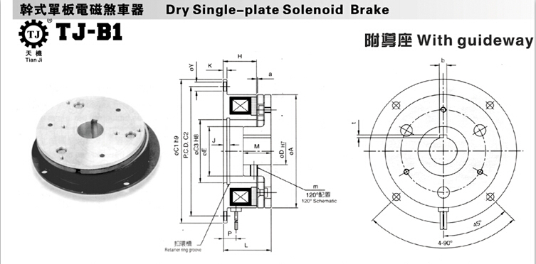 東莞天機傳動的電磁制動器(電磁剎車器)有三款分別為:干式單板電磁制動器(TJ-B)、干式單板電磁制動器帶導座(TJ-B1)、干式單板電磁制動器服軸承導座(TJ-B2)